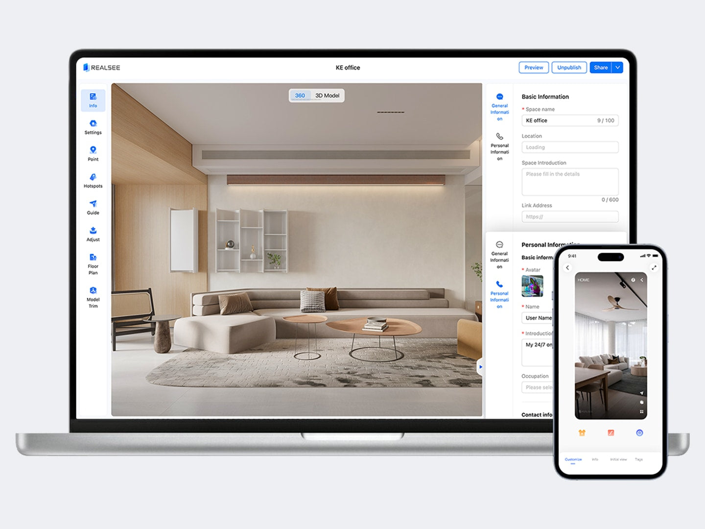 You can generate a variety of VR products such as panoramic images, 3D models, and marketing videos, including immersive 3D Virtual Tours.